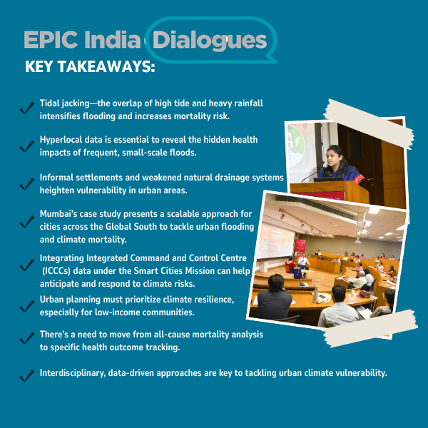 The latest edition of the EPIC India Dialogue took on this pressing issue by examining how climate-induced flooding impacts human health outcomes. In focus were the insights of Ashwin Rode, Director for Scientific Research at EPIC, and Dr. Debolina Kundu, Director at the National Institute of Urban Affairs (NIUA), as they explored the challenges faced by urban systems grappling with climate shocks.